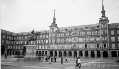 Город условно делится на две части – габсбургскую и бурбонскую. Более старая габсбургская часть сосредоточена вокруг древней улицы Майор, протянувшейся от площади Пуэрта-дель-Соль до королевского дворца. Средневековая городская застройка скрывает древнейшую площадь Мадрида – Ратушную, окруженную придающими ей неповторимый колорит облицованными желтой штукатуркой двухэтажными домами. Возведенное Хуаном Гомесом де Мора в 1640 г. двухэтажное здание городской ратуши, увенчанное высокой двухскатной крышей с мансардными окнами, с пристроенными по углам трехэтажными башнями со шпилями, производит впечатление небольшого замка. Первый этаж этой типичной постройки мадридского барокко с прямоугольными окнами декорирован белым камнем, второй членен белыми пилястрами, фланкирующими окна с треугольными фронтонами, стены покрыты красной штукатуркой, создавая эффектный контраст между этажами. Фигурные аттики над входом и верх башен украшены лепниной.