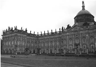 От дворца Сан-Суси прямая аллея ведет к громаде Нового дворца, построенного в стиле рококо в 1763-69 г.г. по приказу Фридриха Великого. Двухэтажное здание, вертикально членененное белыми пилястрами, с окнами, увенчанными полукруглыми и треугольными фронтонами, осенено полукруглым куполом на высоком барабане. Стремление здания ввысь ограничивает изящная балюстрада с вазами и скульптурами, окружающая крышу. На дворцовый фасад обращены 2 отдельно стоящих павильона с шестиколонными портиками и куполами каждый, соединенные красивой полукруглой колоннадой.
