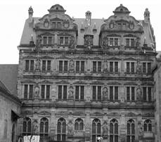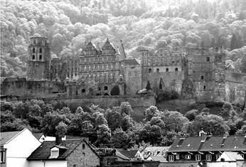 Крутой подъем в гору ведет из города к замку, построенному, как и многие другие здания Гейдельберга, из местного розового песчаника. Преодолев сводчатую каменную галерею, оказываешься на внешней террасе, ранее окруженной массивной стеной с мощными круглыми башнями и бастионами. Комплекс зданий замка, построенных в разное время, выстроился вокруг четырехугольного внутреннего двора, на противоположной от входа с террасы стороне которого высится квадратная надвратная башня с часами. По-соседству с ней чернеют руины древнейшего сооружения замка, дворца первого короля