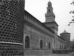 Крепость Сфорцеско была полностью перестроена в 1450 г. из стоявшей на этом месте крепости Висконти Франческо Сфорца по проекту архитектора Филарете, который потом строил соборы Московского Кремля, поэтому можно проследить удивительное сходство стен и башен обоих замков, особенно выделяются любимые гибеллинами зубцы в виде ласточкиного хвоста, повторенные на стенах Кремля. Лодовико Моро пригласил для отделки интерьеров замка Леонардо да Винчи, работы которого частично сохранились и поныне. Огромный замок из красного кирпича с круглыми угловыми башнями под высокими остроконечными крышами, имеет в плане форму прямоугольника, разделенного на девять внутренних дворов. По мощи укреплений можно ощутить, какое шаткое положение занимала власть Сфорца в Милане, если герцогам приходилось скрываться в подобном замке. Центральное место в крепости занимает Герцогский двор, окружающий дворец Сфорца. Его защищают мощные стены с прямоугольными бойницами, разбросанными по всей плоскости стены, а квадратная в плане трехъярусная часовая башня, последний ярус которой с навесными бойницами завершается крышей с фонариком, доминирует над всей постройкой. Комплекс герцогского палаццо образует несколько маленьких двориков, патио, он увенчан мощной квадратной башней с плоской крышей, окруженной зубцами бойниц. На внутренний двор палаццо открывается галерея полукруглых аркад первого яруса на изящных круглых колоннах, над ней расположены небольшие окна в полукруглых арках двух верхних этажей. Интерьер палаццо образуют залы со сводчатыми потолками, некоторые из которых расписаны частично сохранившимися фресками Леонардо да Винчи, состоявшего на службе у Сфорца в качестве архитектора и художника до того момента, как город был захвачен французами во время Итальянских походов. В музее замка хранится его неоконченная скульптура «Пьета», изображающая Богоматерь, оплакивающую тело сына. Здесь также экспонируются забавные барельефы, созданные в честь победы города над Фридрихом Барбароссой и изображающие победное шествие горожан и карикатурные изображения Фридриха и его жены в виде чертей. Также в музее хранятся капители древних колонн позднеримского периода, скульптуры, детали гробниц.