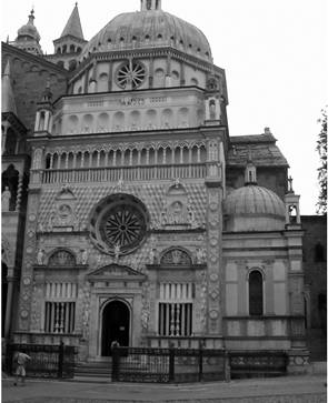 Собор Санта-Мария-Маджоре, частью которого является капелла Коллеоне, был построен в форме латинского креста в 12-13 в.в., а в 18 в. над его средокрестием возвели купол. Массивный собор втиснут в узкое пространство городских улиц, практически не позволяющих обозреть его целиком. Перед треугольным фасадом трансепта, обращенным на Старую площадь, выступает на колоннах величественный портал с двумя ярусами арок со скульптурами под балдахинами. Алтарная часть выделена большой полукруглой апсидой с романской аркадой. Интерьер собора был создан в 16-18 в.в. Нефы разделены полукруглыми аркадами на квадратных пилонах с каннелированными пилястрами, своды украшены лепниной и расписаны фресками.