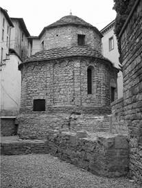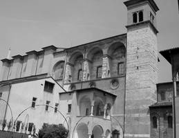 На месте Капитолия сохранились живописные руины базилики, напоминающие о былом величии античного города – часть стены с тремя прямоугольными порталами и 4 колонны, поддерживающие часть портика. А женский бенедиктинский монастырь Санта-Джулия в конце Музейной улицы, один из древнейших в Европе, был основан в 8 в. лангобардским королем Дезидерием. В комплекс монастыря наряду со средневековыми постройками включены и фундаменты римских домов, поэтому даже здесь тесно переплелись две эпохи развития города. Самым старым зданием монастыря, построенным в эпоху раннего Средневековья, является церковь Сан Сальваторе, возведенная в 8 в., один из фасадов которой обращен на внутренний монастырский двор. Ее шестигранник, поставленный на четырехгранник со столь любимыми ломбардцами аркатурными поясками, идущими по верху ярусов, по периметру окружен галереей больших полукруглых арок с колонками посередине.