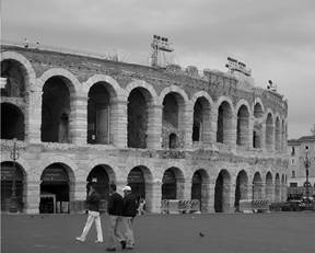 В центре города разбита обширная зеленая площадь Бра, здесь находится ярчайшее свидетельство римского владычества в Вероне, построенная в 1 в. Арена ди Верона, один из крупнейших римских амфитеатров в мире, размеры которой составляют 44*74 м. Арена окружена двухъярусной стеной с полукруглыми белокаменными арками, пространство между которыми заложено кирпичом. Веронской Арене повезло, что в Средневековье ее не использовали как каменоломню, поэтому она очень хорошо сохранилась.
