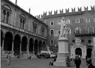 На площадь Синьории обращен один из фасадов палаццо Коммунале, четыре этажа которого, прорезанных маленькими полукруглыми окнами, завершаются зубчатым парапетом. Соседний дворец Совета был возведен в 1476-93 г.г. архитектором Фра Джокондо, его желтое двухэтажное здание выделяется большой открытой лоджией, окруженной аркадой, над которой проходит ярус двухчастнх окон, заключенных в арку с полукруглым расписным фронтоном и расписными пилястрами. Парапет вокруг крыши дворца украшен статуями.