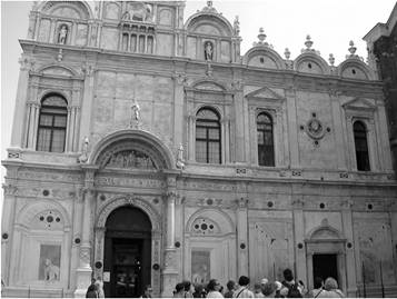 Скуола-ди-Сан-Рока являлась зданием уважаемой и богатой гильдии лекарей. Ее двухъярусный фасад из белого мрамора прорезан сдвоенными полукруглыми окнами, заключенными в полукруглые ниши с фронтонами, фланкированными полуколоннами, этажи разделяет раскрепованный карниз. Однако главное богатство гильдии находится в интерьере – плоские потолки и паруса сводов двух больших залов украшены огромными плафонами работы Тинторетто в окружении резных позолоченных орнаментов. В соседней церкви Сан-Рока хранятся мощи этого святого – покровителя врачей.