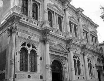 Самую величественную на Большом канале церковь, отмечающую место его впадения в лагуну, Санта Мария делла Салюте, начали строить в 1631 г. в честь избавления города от эпидемии чумы. Она является характерным для Венеции типом купольной церкви, построена из белого мрамора в форме восьмиугольника и увенчана двумя куполами – большим центральным и меньшим, воздвигнутым над алтарем. Каждая грань восьмерика церкви декорирована треугольным портиком с пилястрами, между которыми в нишах установлены статуи, восьмигранный барабан купола окружен галереей с балюстрадой, на которой с двух сторон от каждого портика возвышаются волюты со статуями.
