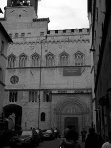 Трехэтажное палаццо Паблико с чуть выгнутым фасадом и зубчатой балюстрадой является напоминанием о годах владычества коммуны Перуджи, когда управление и оборону города вели выбранные горожанами чиновники. Первый ярус фасада, завершенного зубчатым парапетом, открывает полукруглая аркада, второй и третий ярус прорезан трехчастными окнами в стрельчатых нишах, украшенных трифолями.