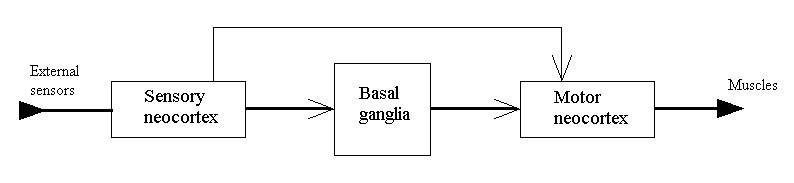 The upper link on the picture is a well known reflex. The link through the basal ganglia is a bit more complicated. It combines the previous principle of stimulus-reaction with sensorimotor coordination. The last detail comes from the fact that muscular actions change the environment and these changes will be perceived by external sensors.