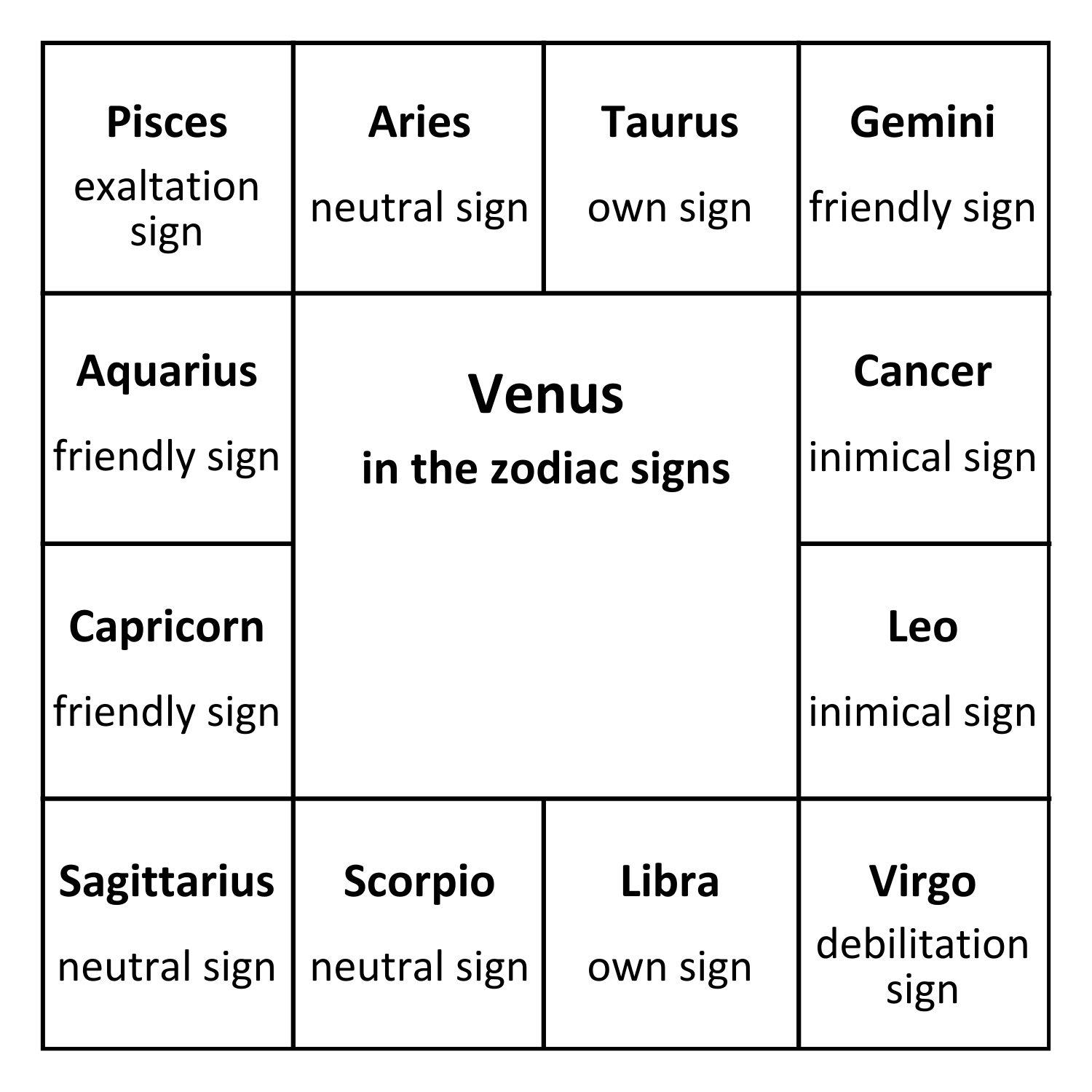 The friendly signs for Venus are Gemini, Capricorn, and Aquarius. In these signs, Venus is not as strong as in her own signs or in the sign of exaltation, but she still performs quite successfully.