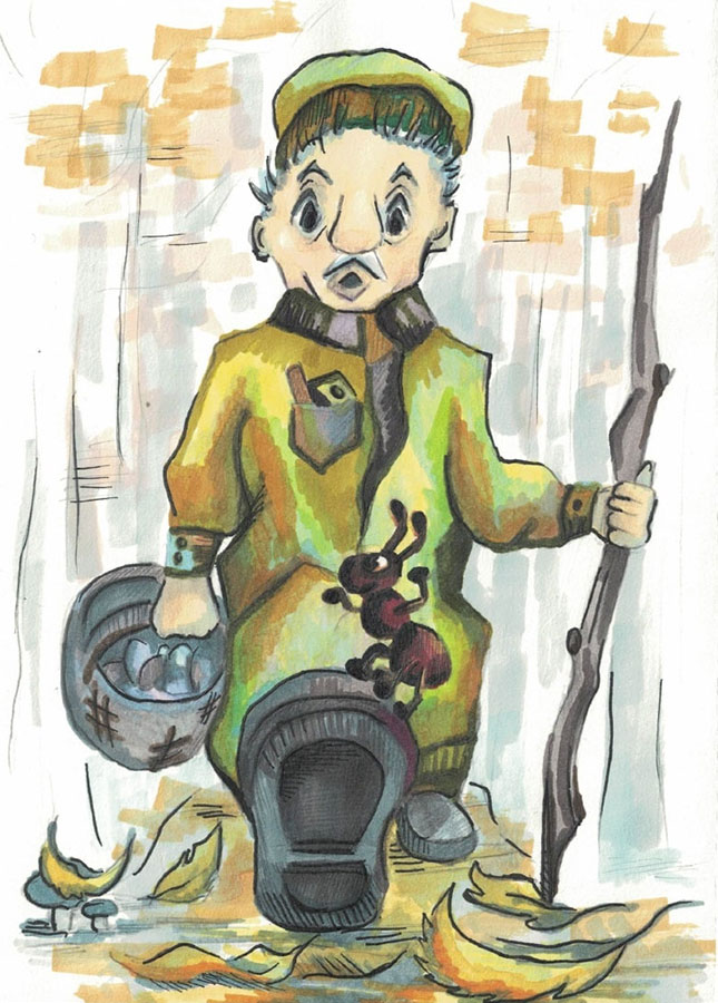 Однажды после дождливого дня на поляне появился человек с корзиной и палкой в руках. Это был грибник. Грибники часто проходили мимо муравейника в поисках грибов. Но этот человек почему-то остановился, озираясь по сторонам. Его внимание привлек огромный дом муравьев. Какое-то время он с интересом наблюдал, как трудятся эти маленькие создания. Один из муравьев решил сойти с тропы, по которой курсировали остальные, из любопытства или в поисках новой добычи, но в это время его догнал муравей покрупнее, который в их колонии выполнял роль стража, и потащил его обратно к сородичам.