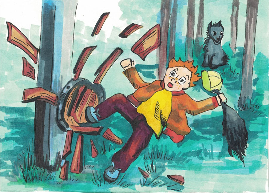 Вдруг Тимур услышал какой-то шорох. Мальчик подумал, что за ним наконец пришел дедушка. Но никто не собирался открывать крышку бочки. Шуршание рядом не прекращалось. Тогда Тимур решил посмотреть в отверстие, что происходит снаружи. От увиденного он еще больше испугался. Возле бочки, принюхиваясь, крутился волк. Он был так близко, что мальчик мог чувствовать его дыхание. Любопытный волк продолжал обнюхивать бочку, виляя хвостом. В какой-то момент хвост волка попал через отверстие внутрь бочки. Растерянный Тимур схватился за хвост, намотал его на руку и что было мочи закричал, зовя дедушку на помощь. От неожиданного крика испуганный волк помчался вперед, потащив бочку за собой.