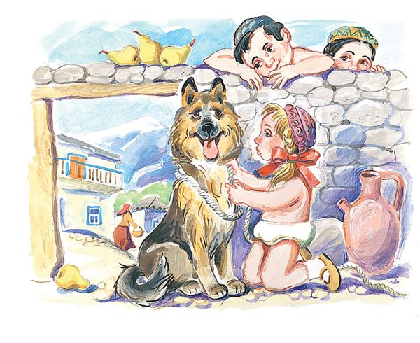 Наконец, набравшись храбрости, Гуля вскарабкалась на выступ в каменной ограде и увидела большую серую овчарку. Собака отчаянно крутила головой, стараясь освободиться от толстой веревки, заменявшей цепь.