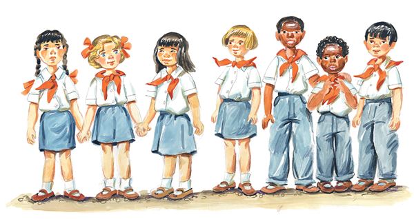 …И вот Гуля уже стоит на торжественной линейке. Справа и слева от нее – китайские девочки: Чи-чу и Ту-я. И везде, во всю длину линейки, – знакомые ребята: Росица, Митко и Петро из Болгарии, Энрико из Гаваны, Иосиф из Венгрии, маленький негр Нилли из Америки, Китами из Японии, Лена из Сербии…