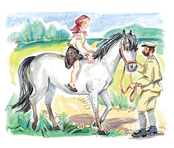 Она уселась поудобнее и дернула поводья. Сивко не тронулся с места. Гуля сжала ногами бока лошади, но она не шелохнулась. Красноармеец потрепал коня по загривку и сказал: