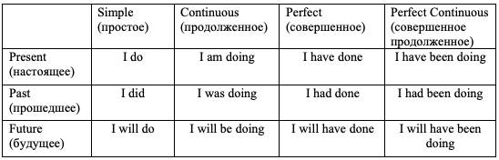В английском языке 12 времен, таблица, приведенная ниже, дает краткое пояснение по образованию времен: