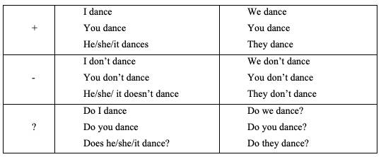 He/she/it dances – takes – breaks – makes