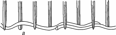 а) концы расположены с лицевой стороны основы друг над другом и торчат в разные стороны. Следующими рядами они будут плотно прижаты, поэтому их можно будет ножом аккуратно обрезать;