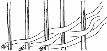 б) если прутья достаточно толстые, то скорее всего правильнее будет приметить следующий способ: окончившийся комлем прут обрезать на основе, и к нему плотно прижать новый прут;