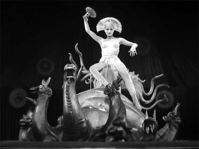 Герой фильма «Метрополис» (1927, режиссер Фриц Ланг) смотрит на дьявольскую богиню – Лже-Марию, выступающую в театре, вот она (обратите внимание на ее множественность, проявляющуюся в множественности драконов, ее везущих):