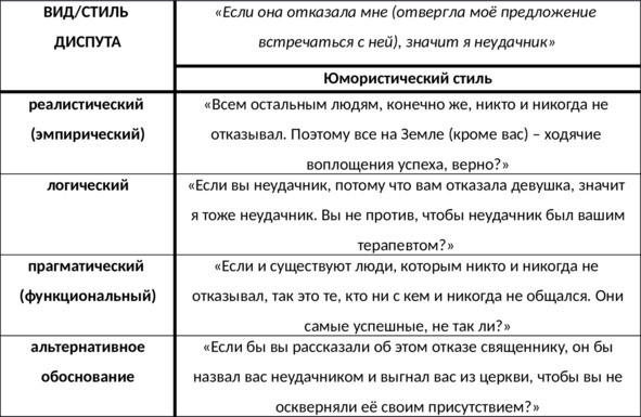 Необходимо особо отметить, что вопросы сократовского диалога, задаваемые терапевтом, способствуют интериоризации58 клиентом процесса последовательного вопрошания с целью критического анализа своих мыслей, осознанного выбора поведения и становления самому себе психотерапевтом.