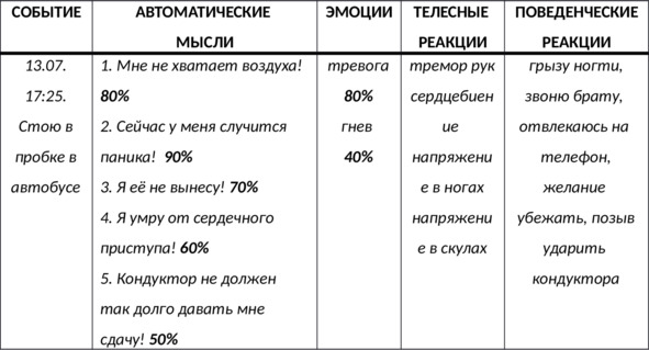 N.B. Не описывайте эмоции в колонке для автоматических мыслей: помните, что фраза «Я почувствовал тревогу» описывает эмоцию, которую стоит одним словом описать в колонке для фиксирования эмоций.