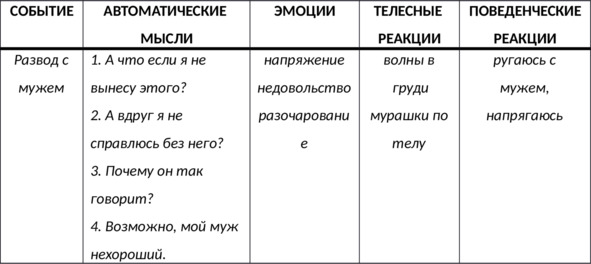 N.B. Важно выявлять первую автоматическую мысль, которая пронеслась в вашей голове за считанные доли секунды до возникновения той или иной эмоции: как правило, первые мысли – это оценка ситуации, которую вы можете раскрыть, задав себе вопрос: «Что для меня значит эта ситуация?»