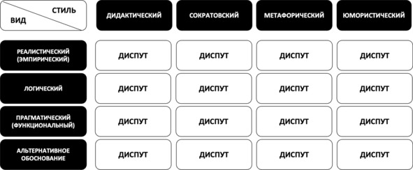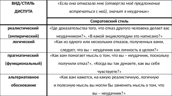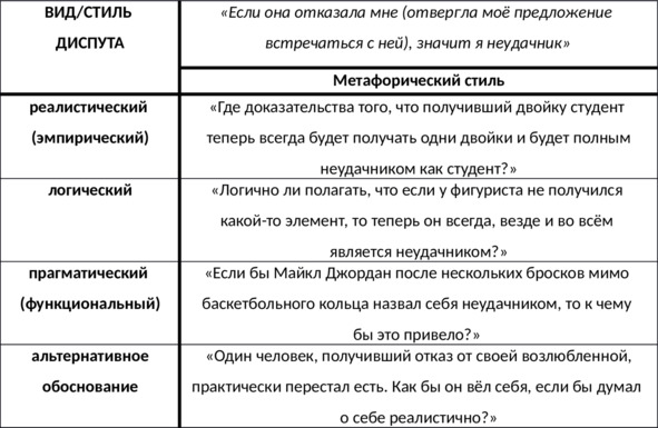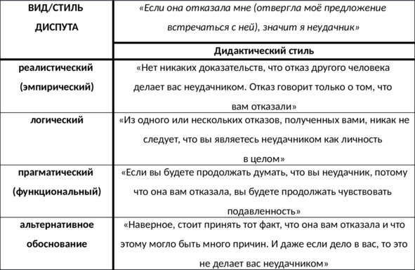 Таким образом, всего можно выделить шесть видов диспута (реалистический (эмпирический), логический, прагматический (функциональный), альтернативное обоснование, а также дополнительно – эвристический и самораскрытие терапевта) и пять стилей диспута (дидактический, сократовский, метафорический, юмористический и дополнительно – активный), что в сумме даёт тридцать возможных вариантов оспаривания одного иррационального верования. Однако во избежание информационной перегрузки и когнитивного ступора и диссонанса далее будут рассмотрены по четыре основных вида и стиля диспута (реалистический, логический, прагматический, альтернативное обоснование – виды; дидактический, сократовский, метафорический, юмористический – стили).