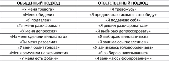 В своё время американский психиатр У. Глассер разработал терапию реальностью (на основе теории выбора), которая отвергает понятия тревоги и депрессии как существительных и определяет эмоции и поведение человека с помощью отглагольных форм. Такой подход акцентирует внимание человека на том, что он сам создаёт свои избыточные реакции, а не является их жертвой. Ниже приводятся высказывания, иллюстрирующие разницу между обыденным и ответственным подходами человека к своим эмоциям (таб. 1).