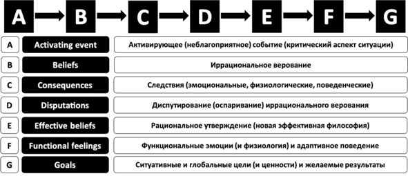 Необходимо отметить, что формула А-В-С является диагностической, поскольку отражает механизм формирования дисфункциональных реакций, в то время как её продолжение (D-E-F-G) представляет собой терапевтические шаги для устранения избыточных реакций и улучшения качества жизни. Итак, согласно представленной модели, человек имеет определённые цели (и ценности) (G), на пути осуществления которых встречаются препятствия в виде активирующих событий (А). Однако человек свободен выбирать, как относиться (В) к этим событиям (А), что и обуславливает его здоровую или нездоровую эмоциональную и поведенческую реакции (С). Если рациональное мышление приводит человека к функциональным эмоциям и адаптивным действиям, то иррациональные представления создают нездоровые реакции. В этой связи главным препятствием на пути реализации жизненных целей человека (G) являются не сами по себе неблагоприятные активирующие события (А), а иррациональные верования (В), порождающие неадаптивные реакции (С), избавиться от которых возможно за счёт диспутирования иррациональных верований (D) и формирования альтернативных рациональных утверждений и (шире) новой эффективной философии (E), которая создаёт здоровые эмоциональные и поведенческие реакции (F) и способствует достижению значимых для человека целей, осуществлению ценностей, исполнению желаний, реализации интересов и удовлетворению потребностей (G).