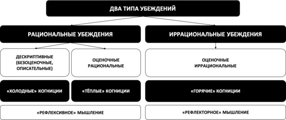 Можно сказать, что если рациональные убеждения («холодные» и «тёплые» когниции) отражают менее рефлекторный и более рефлексивный способ восприятия реальности, то иррациональные убеждения («горячие» когниции) представляют собой, соответственно, более рефлекторный (менее рефлексивный) способ восприятия. Необходимо также отметить, что в некоторые иррациональные убеждения человек верит полностью, постоянно, очень сильно и придерживается их в большинстве ситуаций, а к некоторым неразумным представлениям относится более критически, придерживается их иногда, не очень яро и только в некоторых (конкретных) ситуациях. В силу того что, как выразился Эллис, «горячие мысли имеют разную степень нагрева» (Эллис, 2021), эти иррациональные верования, скорее всего, потребует большего количества времени для того, чтобы их оспорить, изменить и отказаться от них. В схематичном виде вышеописанные типы убеждений представлены ниже (рис. 10).