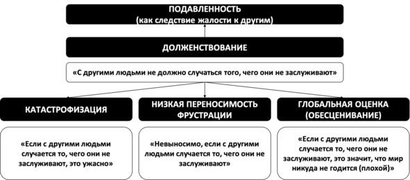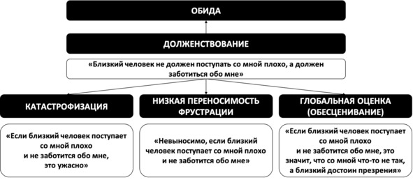 С точки зрения РЭПТ источником любой нездоровой негативной эмоции является долженствование, а также одно или несколько производных от него убеждений – катастрофизация, низкая переносимость фрустрации и/или глобальная оценка (себя, других или мира). В случае с обидой её когнитивный фундамент в схематичном формате выглядит следующим образом (рис. 21):