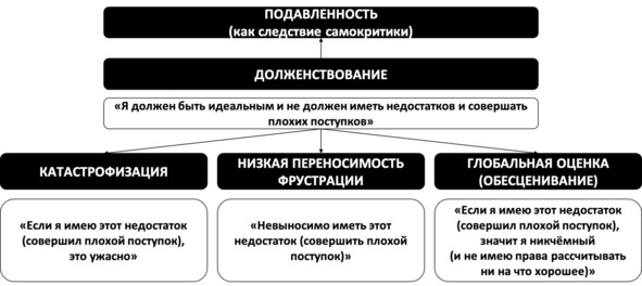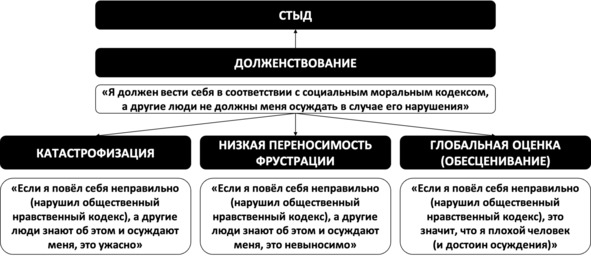 С точки зрения РЭПТ источником любой нездоровой негативной эмоции является долженствование, а также одно или несколько производных от него убеждений – катастрофизация, низкая переносимость фрустрации и/или глобальная оценка (себя, других или мира). В случае с стыдом его когнитивный фундамент в схематичном формате выглядит следующим образом (рис. 30):