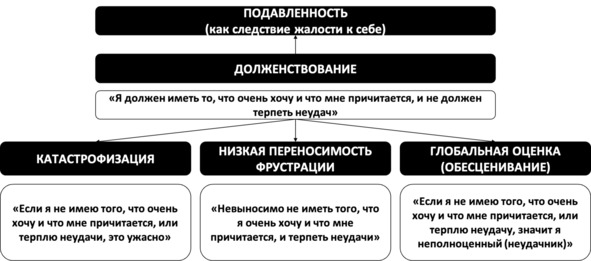 С точки зрения РЭПТ источником любой нездоровой негативной эмоции является долженствование, а также одно или несколько производных от него убеждений – катастрофизация, низкая переносимость фрустрации и/или глобальная оценка (себя, других или мира). Как пишут А. Эллис и И. Беккер, депрессия вызывается двумя главными иррациональными верованиями, первое из которых приводит к эго-тревоге и самокритике («Я должен был справиться, но не сумел, поэтому я – неадекватный и меня преследуют неудачи»), в то время как второе верование отражает низкую переносимость фрустрации: «В моей жизни не должно быть места ничему плохому, а когда что-то такое происходит, это абсолютно невыносимо!» (Эллис, Беккер, 2023). Ниже представлены РЭПТ-формулы подавленности, связанной с самокритикой (рис. 23), жалостью к себе (рис. 24) и жалостью к другим (рис. 25).