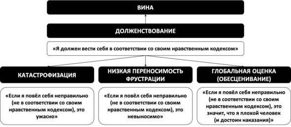 С точки зрения РЭПТ источником любой нездоровой негативной эмоции является долженствование, а также одно или несколько производных от него убеждений – катастрофизация, низкая переносимость фрустрации и/или глобальная оценка (себя, других или мира). В случае с виной её когнитивный фундамент в схематичном формате выглядит следующим образом (рис. 28):