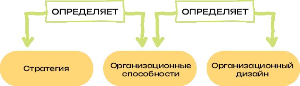 Обратите внимание, что стрелки на рисунке проведены не только слева направо, от стратегии к организационным способностям и дизайну, но и в обратную сторону. Если организационный дизайн слишком амбициозный и организация не в состоянии его имплементировать, список способностей может быть изменен. Как и стратегия, если она пока недостижима.