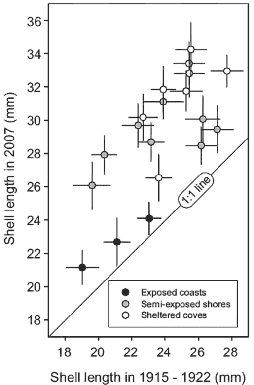 Далее авторы статьи сравнивают размеры раковин Nucella lapillus, собранные в 2007 году ровно на тех же участках (судя по сохранившимся описаниям), где эти раковины собирались в 1915–1922 годах. И делают заключение, что раковины явно увеличились в размерах: