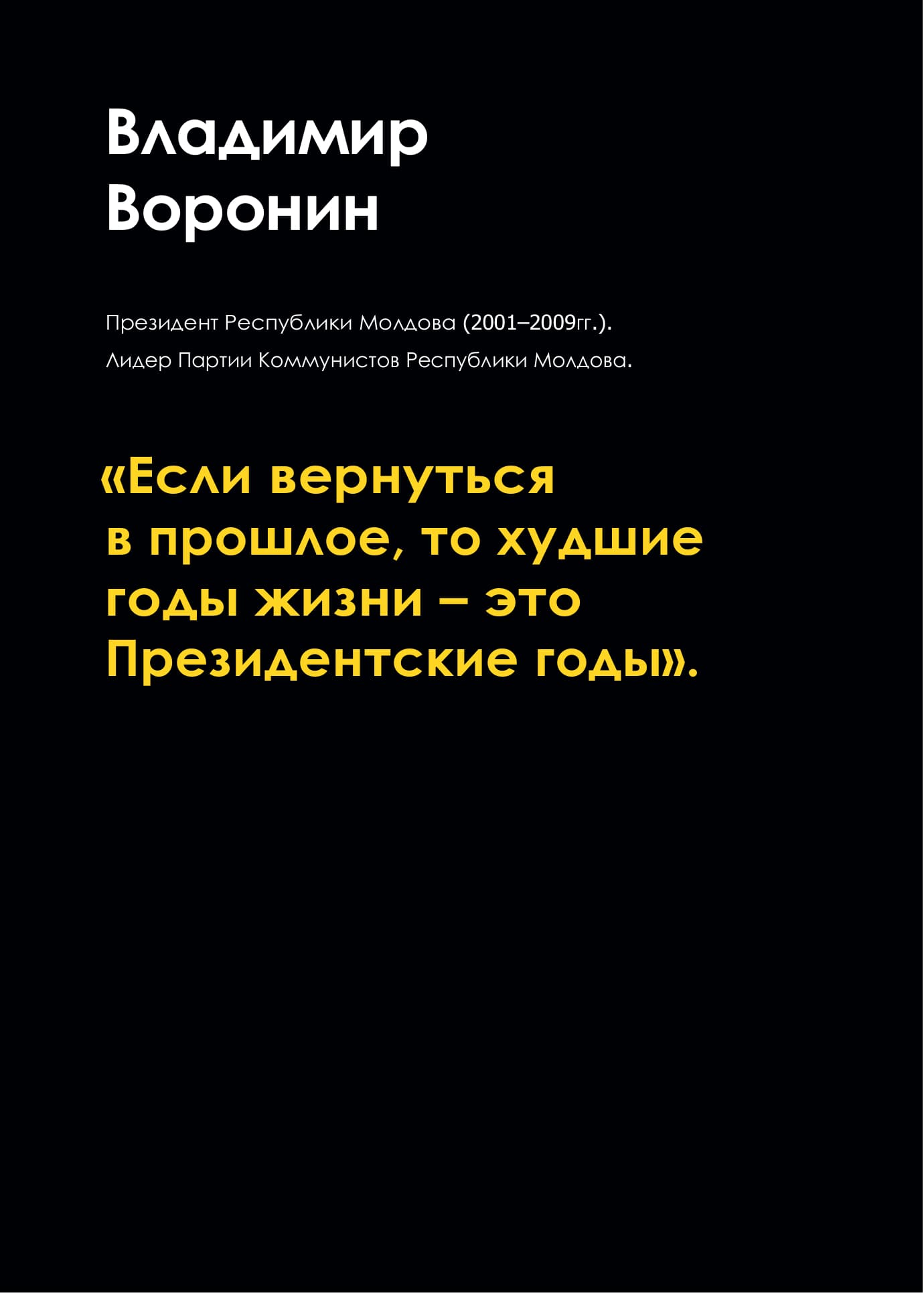 Если говорить персонально, то Влад Плахотнюк при нас не занимал никакой официальной должности, ни самой маленькой, ни самой большой. Он занимался бизнесом, а бизнесом занимаются многие. Мне приписывают много учеников. За восемь лет на руководящие должности было выдвинуто много людей. Одни приходят, другие уходят – это естественный ход событий. Правящая власть различными путями, чаще всего –неправильными, избавилась от многих людей по причине того, что они были «учениками Воронина». Но почему-то при нас, так называемые «плохие ученики» работали очень хорошо. А те, кого сегодня выдвигает власть, и которые не являются учениками Воронина, работают очень плохо. Страна не развивается, нищает, стоит на месте… и, если бы на месте, она сдала назад. Это всё попытка оправдать свою несостоятельность и неумение руководить страной. Власти хотят все, но как оказалось, это не такой лёгкий процесс. Они взялись за гуж, который им не под силу и для того, чтобы выпутаться и оправдаться перед народом, который за них голосует и перед западом, который их спонсирует, они выдумывают разного рода легенды.