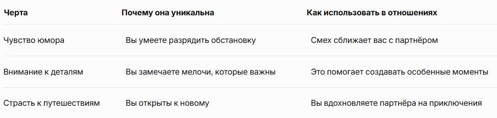 В контексте отношений знание своих сильных сторон помогает вам подойти к знакомству с ясностью и открытостью. Вы перестаёте пытаться подстраиваться под чужие ожидания и начинаете искать партнёра, который будет ценить именно ваши качества. Например, если вы понимаете, что ваша способность слушать и поддерживать делает вас особенной, вы будете искать человека, который нуждается в такой поддержке и готов ответить тем же. Если вы знаете, что ваша энергия и любовь к приключениям – это ваша сильная сторона, вы найдёте партнёра, который разделяет эту страсть и готов отправиться с вами в совместное путешествие.