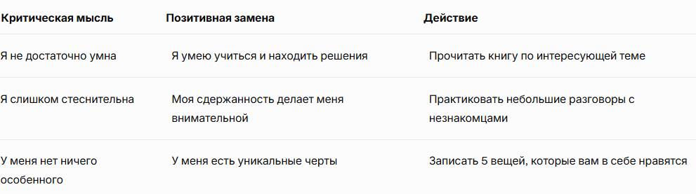 Часто самооценку подрывают внутренние голоса, которые говорят: «Ты недостаточно хороша», «Ты не заслуживаешь любви» или «У тебя ничего не получится». Эти мысли могут быть результатом прошлого опыта, критики от окружающих или даже сравнения себя с другими. Чтобы преодолеть эти барьеры, важно научиться замечать эти мысли и оспаривать их. Когда вы ловите себя на самокритике, спросите себя: «А правда ли это? Есть ли доказательства, что я действительно не справлюсь?» Часто вы обнаружите, что эти мысли не имеют под собой оснований.