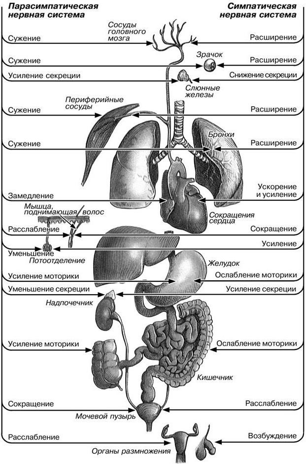 Центральная нервная система осуществляет контроль над вегетативной системой через гипоталамус и продолговатый мозг.