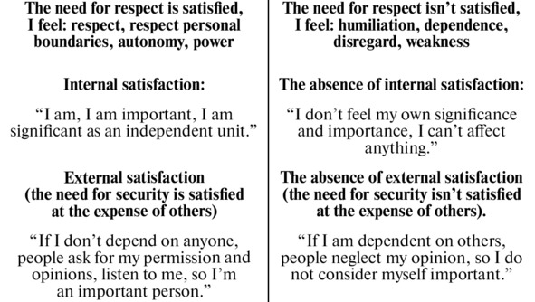 Someone, for example, is ready to shout aloud, give up relations, leave work, remain without means of living in order to prove justice. This behavior will indicate that for a person at the moment the most important is the need for respect.