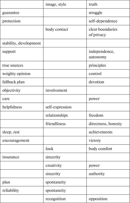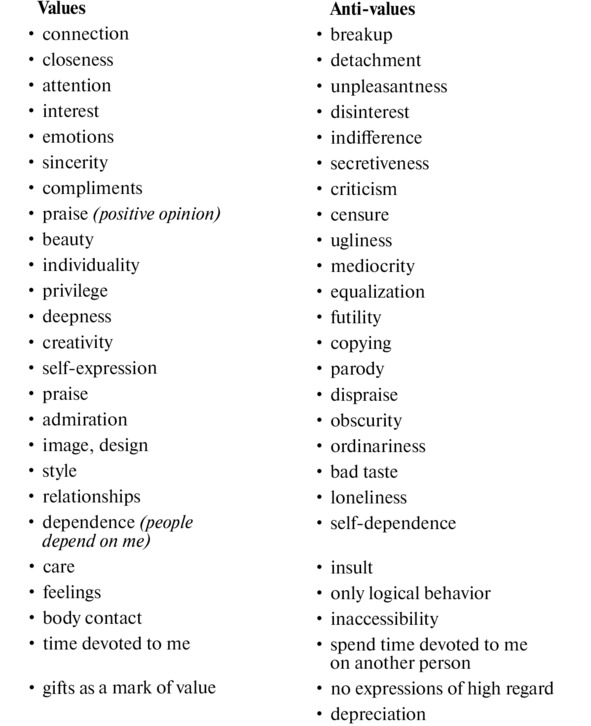 The list of values of a person with a leading need for love, acceptance, attention is given in the table below. There are practically no contradictions inside this table. With the exception of and , often the image involves a certain embellished look. It turns out that a person with a leading need for love highly values sincerity, but does not want to show himself real. sincerity image