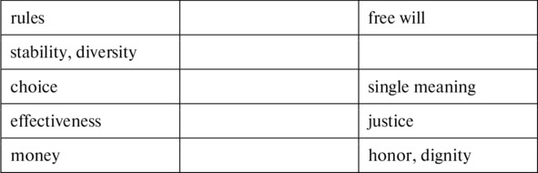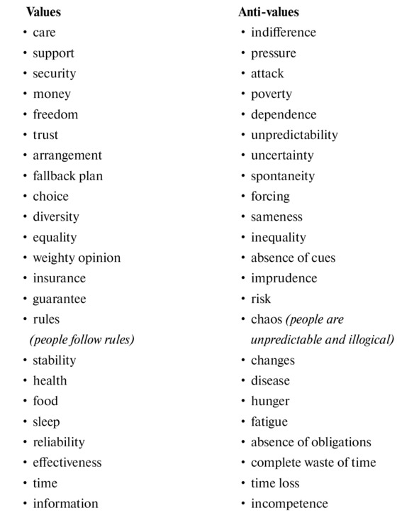 According to the list in the table, you can notice a values conflict, for example, stability and diversity, or care and freedom. Any diversity implies changes, except in situations when you, having diversity, choose the same. Care, however, implies a connection, and therefore, dependence on another person, and in this case, there can be no talk of complete freedom. There are special relationships with value rules. They are very necessary in order to understand how others should and will act, but I don’t want to act according to the rules myself, as this means a lack of choice and diversity, which are also values. When there are no rules, it’s also bad – chaos (anti-value) arises, you don’t know from whom and what to expect. It turns out that such people need rules and clear instructions, but they themselves violate them.
