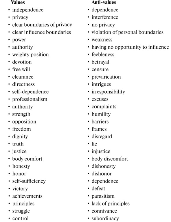 “Weakness”, “inability to influence,” “helplessness” are examples of the anti-values of the need for respect. Usually we meet with them when life circumstances are irreversible or the opponent is much stronger than us.