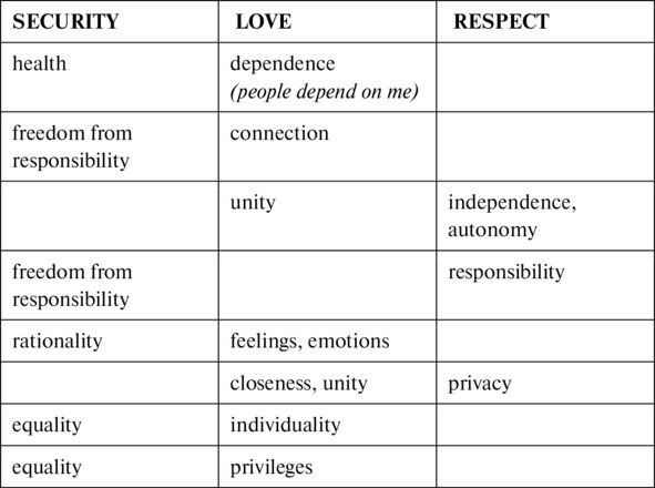 Let’s remember that all three needs are important for each of us, and look at all three tables with values. You may notice multiple conflicts. For example, autonomy satisfies the need for respect, but denies communication, which is very valuable for satisfying the need for love. And the availability of options, which is so important for satisfying the need for security, means evasion and unwillingness to make decisions that do not satisfy the need for respect. Only a good understanding of yourself, clear internal priorities and conscious goals allow you to resolve these internal conflicts and find the necessary balance among your needs. There are possible value conflicts in the table below. Columns indicate needs, and rows indicate conflicts.
