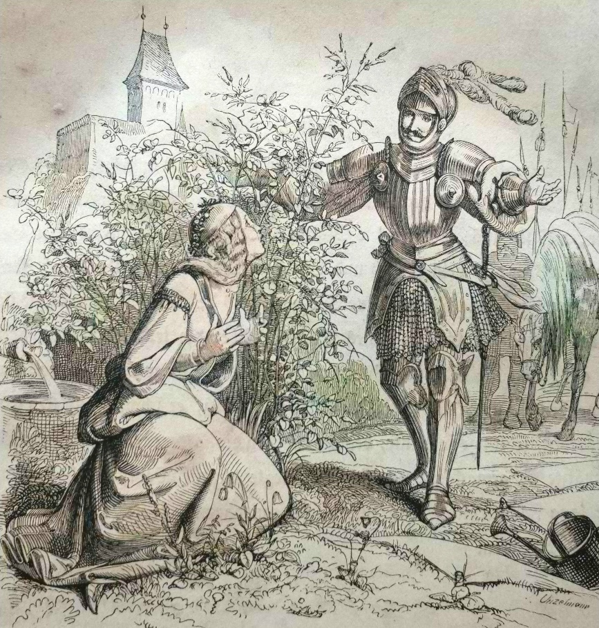 С наступлением назначенного дня она беззаботно выпрыгнула на лужайку, расстелила полотно, чтобы то пропиталось утренней росой. Как только она закончила отбеливать и немного осмотрелась вокруг, то увидела великолепный полк рыцарей и юношей. Она еще не приводила себя в порядок, поэтому спряталась за диким кустом роз, который только что расцвел, и стала смотреть на великолепную кавалькаду. Прекрасный рыцарь из толпы, молодой стройный человек в открытом шлеме, спрыгнул к кусту и заговорил мягким голосом: