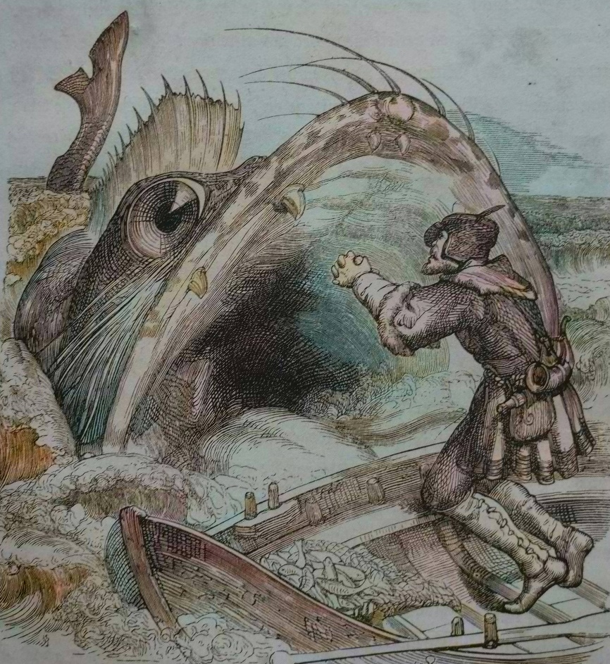 Примерно на расстоянии брошенного камня от берега его маленькая лодка на полном ходу встала прочно и неподвижно, как будто села на мель. Граф тоже поверил в это и работал изо всех сил, хотя и тщетно, чтобы снова оказаться на плаву. Вода вокруг стала убывать, плавучее средство, казалось, зависло на утесе и поднималось высоко над водой. Неопытному рыбаку стало не по себе. Хотя лодка стояла как пригвожденная, граф, казалось, со всех сторон удалялся от берега. Пруд превратился в большое озеро, вздымались валы, ревели и пенились волны. С ужасом он увидел, что его лодку несла на спине огромная рыба. Он сдался своей судьбе, с тревогой ожидания, какой исход она принесет. Внезапно рыба нырнула, его ореховая скорлупа снова была на плаву, но через мгновение морское чудовище поднялось над водой. Открыло отвратительную пасть, как врата ада, и из темной глотки, как из-под земли, раздались громкие слова: