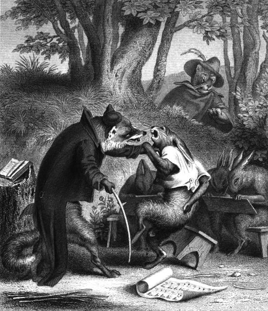 Знаменитый немецкий поэт Гёте, заинтересовавшись этими народными легендами, собрал их в одно стройное целое и создал великолепную поэму под заглавием «Рейнеке-лис». Поэма эта сделалась одним из классических произведений всемирной литературы. Изданная первоначально по-немецки, она впоследствии появилась в переводе на все европейские языки и всюду признана одним из самых выдающихся произведений животного эпоса, т. е. такого рода поэтических произведений, в котором речи и поступки людей присвоены разным представителям животного царства.