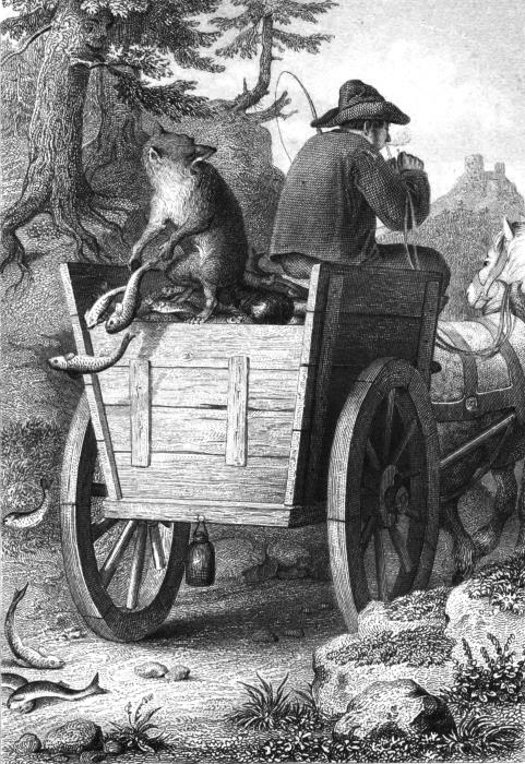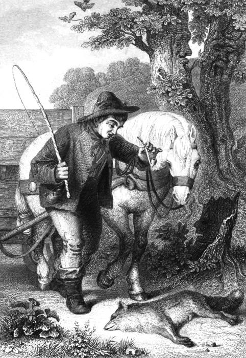 А вот и другая проделка, которую также расскажу правдиво. Рейнеке-лис пронюхал, что у одного крестьянина имеется жирная туша свиньи, только что убитой. Он сообщил об этом волку. Они отправились туда, условившись честно разделить между собою и добычу, и опасность. Но опять-таки труды и опасность выпали на долю одного дяди: он и в окошко пролез, он же и добычу сбросил волку с огромными усилиями. К несчастью, собаки были недалеко, почуяли присутствие дяди в доме и страшно изуродовали ему шкуру. Израненный, он убежал от них, поспешно разыскал волка, пожаловался ему на свои страдания и потребовал своей доли. А тот и отвечает: «Я оставил тебе отличный кусочек. Ты будешь благодарен мне за него. Гляди же хорошенько: какой там вкусный жир!» И он принес «кусочек» – деревянную распорку, на которой туша висела в избе у крестьянина… Вся же туша была пожрана жадным, несправедливым волком. Разгневанный Рейнеке и слов не нашел; но не трудно понять, что он должен был чувствовать…