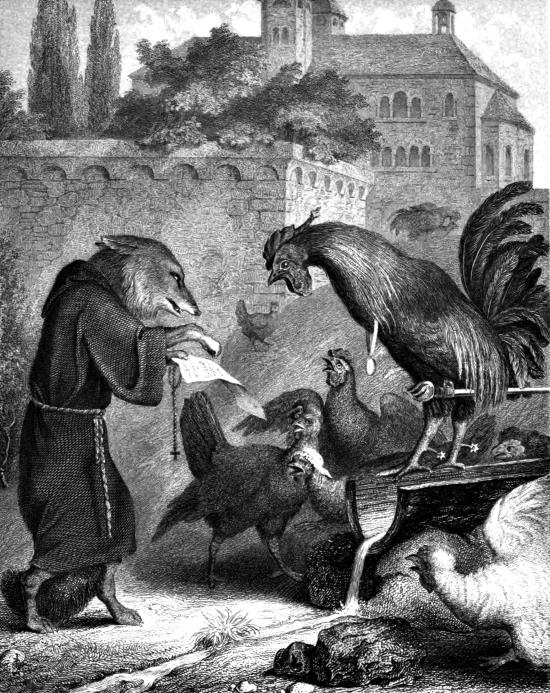 Слушайте, однако, дальше. Проходит немного времени, – он является в образе монаха и вручает мне письмо с печатью. Я сразу узнал вашу печать на письме, а в нем значилось, что вы объявили прочный мир и зверям, и птицам. Рейнеке начал мне рассказывать, будто он стал монахом, дал обет отмаливать все свои грехи и раскаивается в них. Значит, больше нечего уж кому бы то ни было бояться его, поклявшегося никогда не есть мяса. Он дал мне рассмотреть свою рясу и показал нарамник[2], предъявил мне даже и свидетельство, выданное ему одним из начальников католических монастырей; наконец, чтобы окончательно убедить меня, показал мне под рясой свою власяницу. Потом он пошел и сказал: «Да сохранит вас Господь Бог! Мне же сегодня предстоит еще много дела, да, кроме того, надо прочитать еще молитвы», – и он даже назвал, какие именно молитвы нужно ему читать. Уходя, он, действительно, читал молитву, но думал в это время о том, как погубить нас. Я с восторженным сердцем поторопился рассказать своим детям о радостной вести в вашем письме, и все были обрадованы этим. Рейнеке-лис стал монахом – значит, нам нечего было более бояться за свою жизнь.
